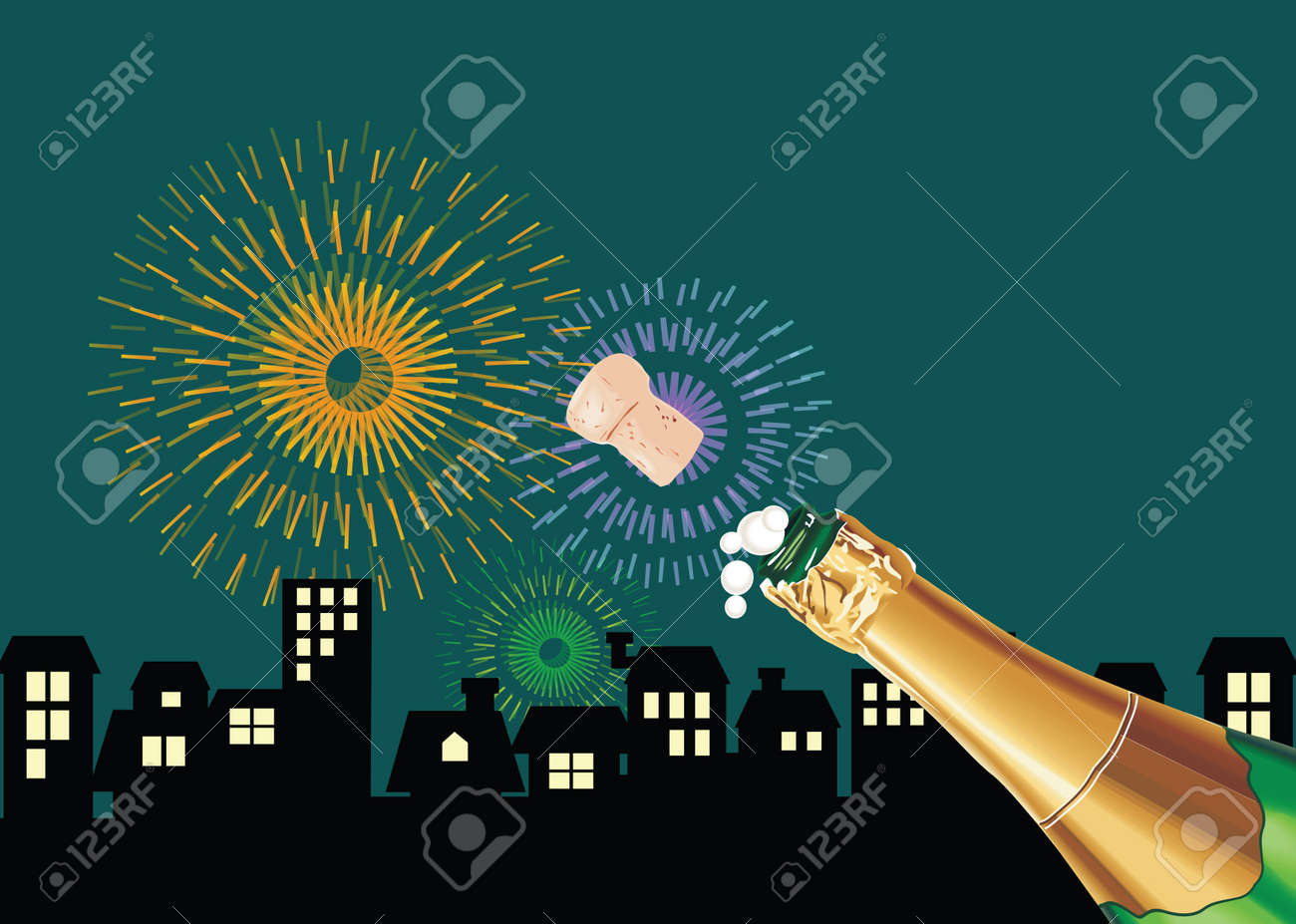 New Year's Eve celebration with champagne and fireworks. Vector illustration.