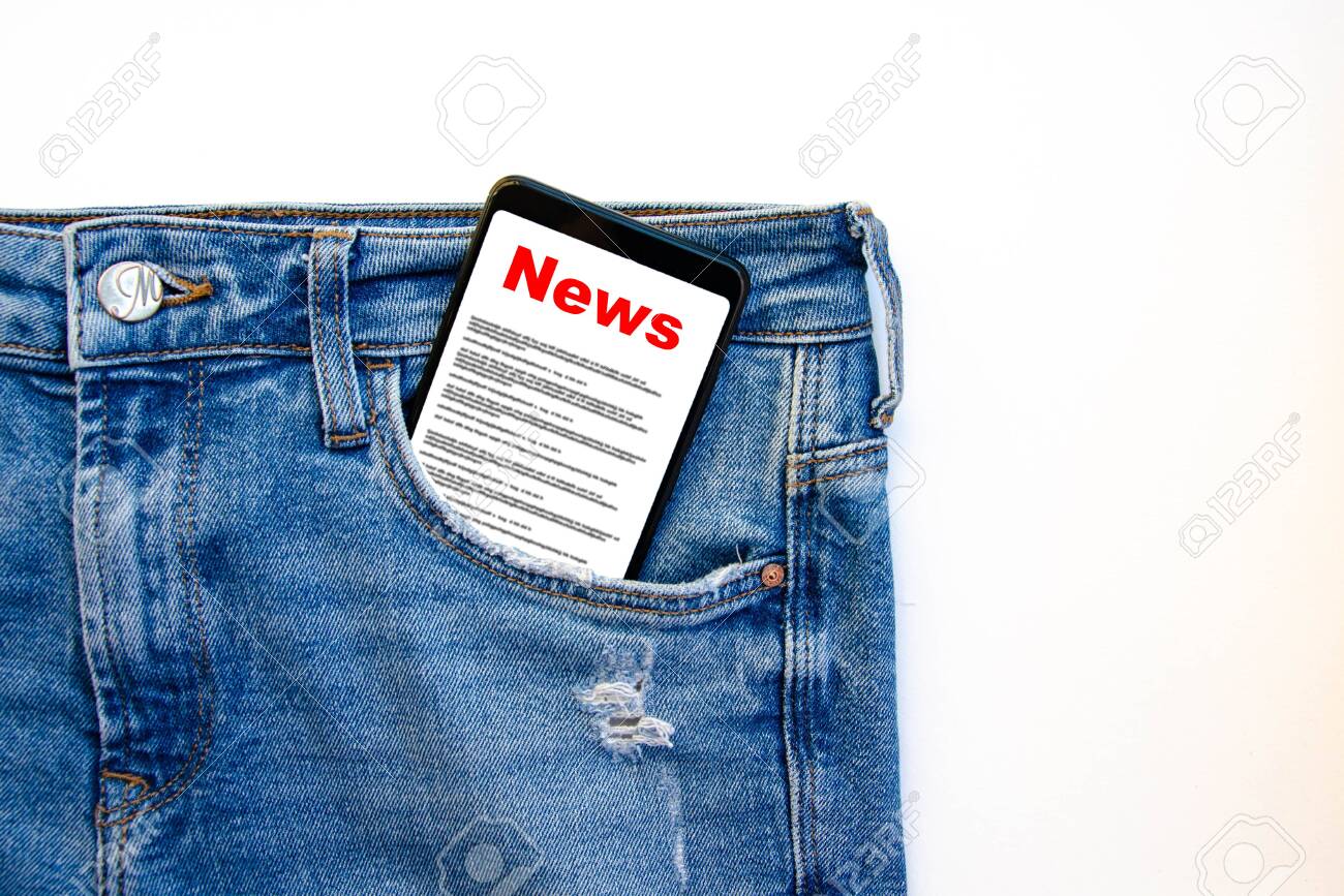 A smartphone peeks out of a worn denim pocket, showcasing a headline that reads 'News,' symbolizing the intersection of fashion and information in modern daily life.