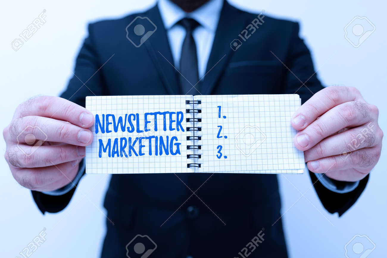 A well-dressed professional highlights key points in a notebook about the importance of newsletter marketing, emphasizing innovative strategies for engaging audiences and driving brand awareness.