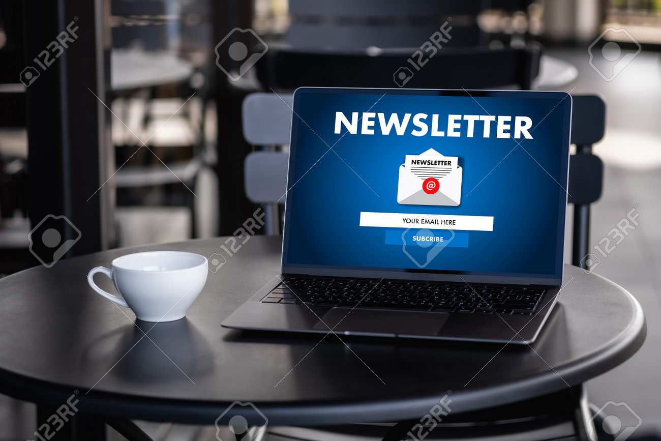 Inviting your attention, the sleek laptop screen displays a vibrant newsletter sign-up, accompanied by a steaming cup of coffee, perfect for a cozy café setting. This blend of technology and relaxation creates an inspiring workspace for those eager to stay connected and informed.