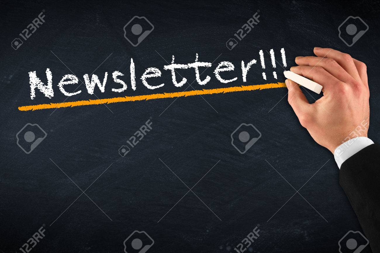 A hand in a suit elegantly writes 'Newsletter!!!' on a chalkboard, emphasizing the importance of communication and updates in our fast-paced world.