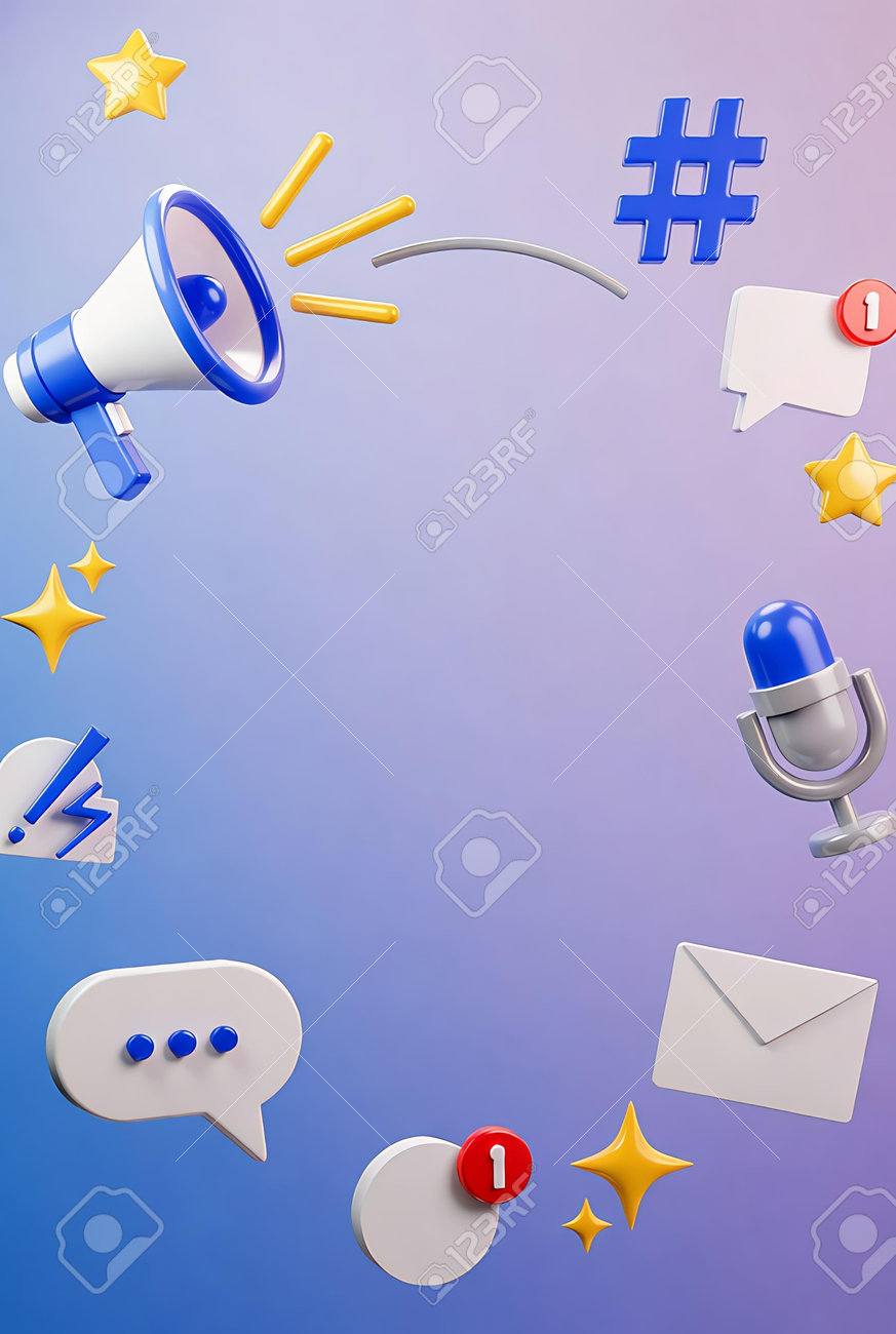 Megaphone with speech bubbles on blue background. 3D illustration. - 262390132