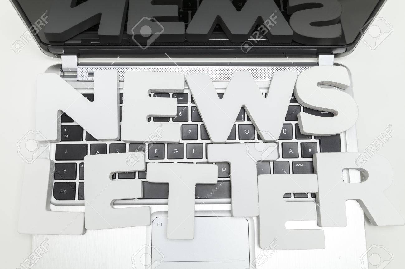 A modern workspace comes to life with oversized letters spelling out 'NEWSLETTER,' symbolizing the importance of communication in the digital age. The sleek laptop serves as a backdrop, embodying innovation and connectivity.