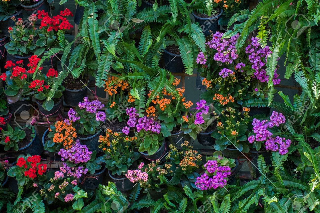 A vibrant display of blooming flowers and lush ferns creates a stunning vertical garden, inviting nature enthusiasts to revel in their beauty. Each plant showcases unique colors and textures, weaving together a tapestry of life and tranquility.