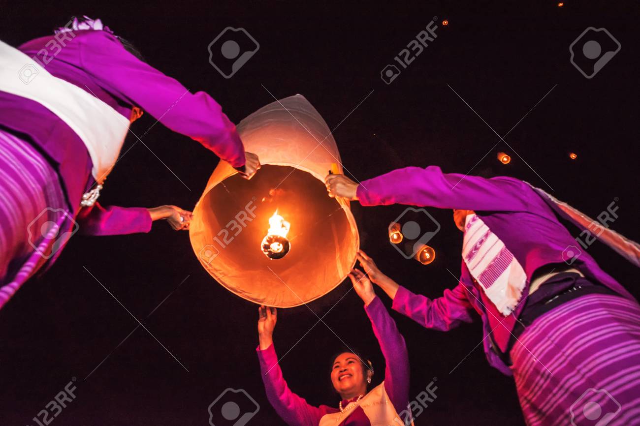CHIANG MAI, THAILAND - NOVEMBER 13 : Unidentified women in traditional dress release floating lamp made of paper in LAMP Festival at San Kamphaeng district on November 13, 2015 in Chiangmai,Thailand. - 49317076