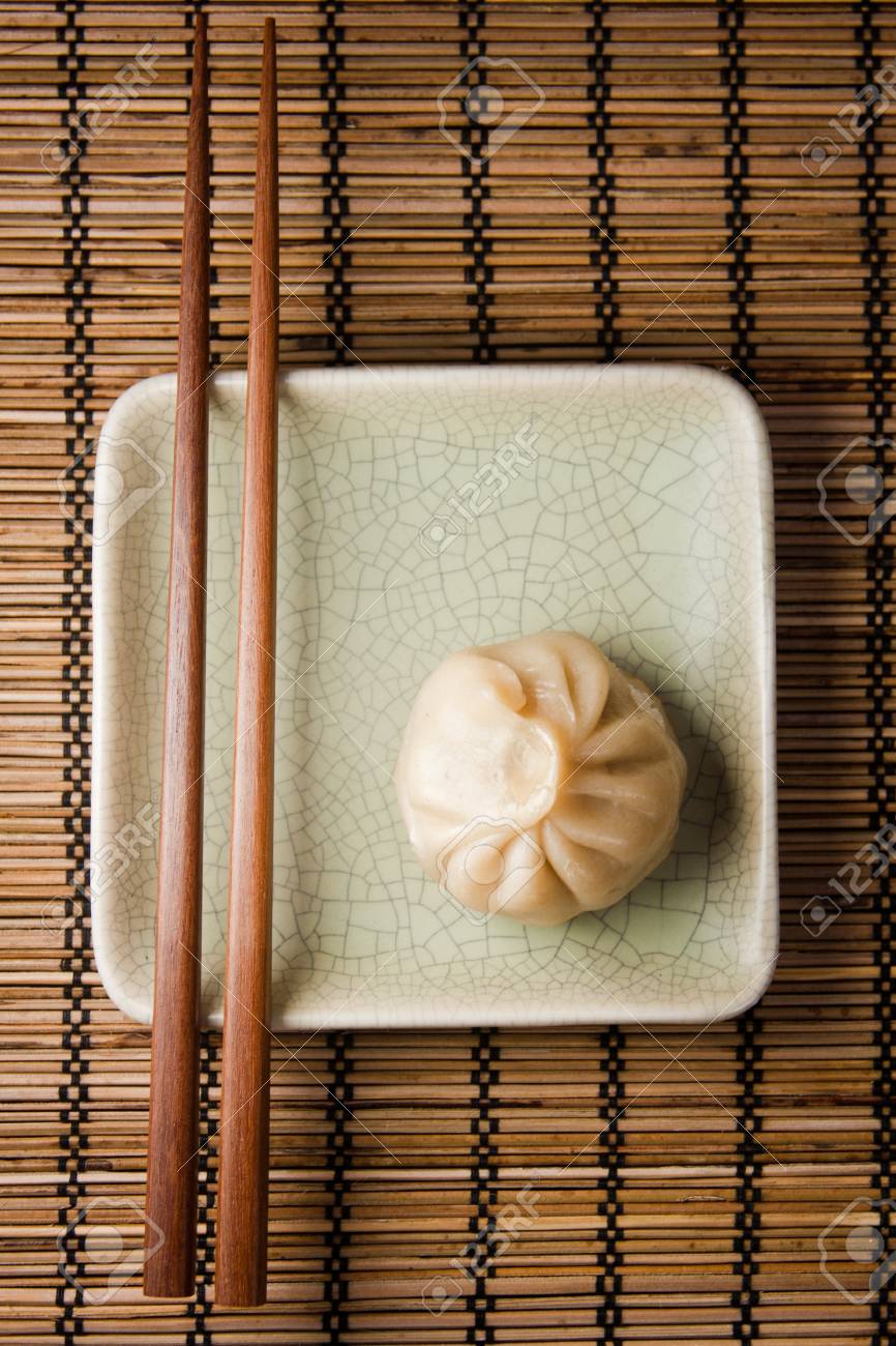 Chinese steamed dumplings in a ceramic plate with chopsticks
